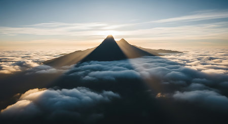 Experience the breathtaking beauty of a sunrise illuminating a majestic mountain peak above a sea of clouds, showcasing nature's serene landscape.