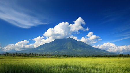 A breathtaking view of the perfectly conical Mount Mayon volcano, an active stratovolcano, rising majestically above vibrant green rice paddies, showcasing its iconic symmetry and the fertile landsca.
