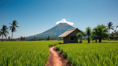 Scenic path through rice fields at sunrise with active volcano erupting in background
