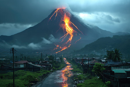 landscape with a dangerous volcanic eruption near the village