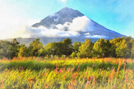 View of Opala volcano colorful painting looks like picture, Kamchatka Peninsula, Russia.