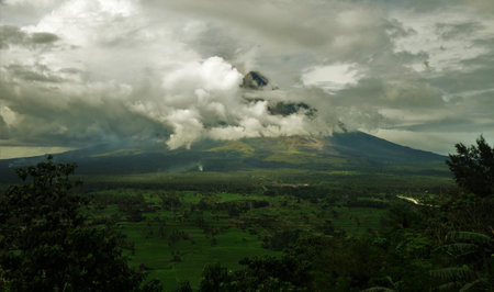 Asian Mayon Volcano on Luzon Island Philippines. Tropical Trees Palms, High Mountain Peak and Clouds Sky. Panoramic Photo on Wonderful Famous National Tourist Landscape View from Climb