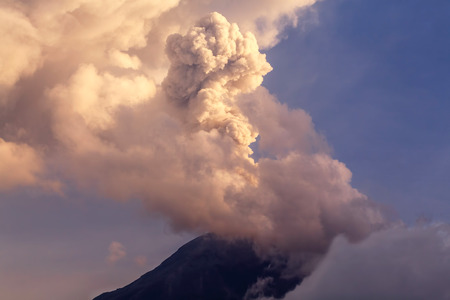 Volcanic eruption volcano erupting with smoke ashes old mountain peak sky covered with fumes natural disaster catastrophe exploding explosion national park lava