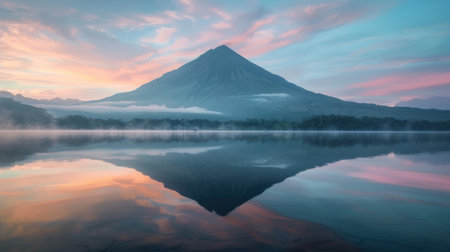 A stunning mountain landscape at sunrise, with the peak reflected perfectly in the calm waters of a tranquil lake.
