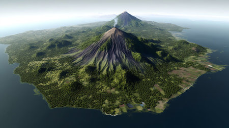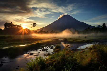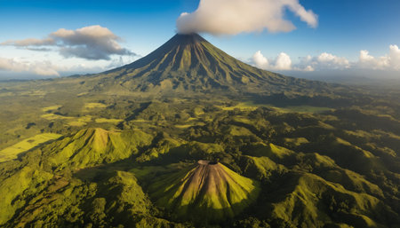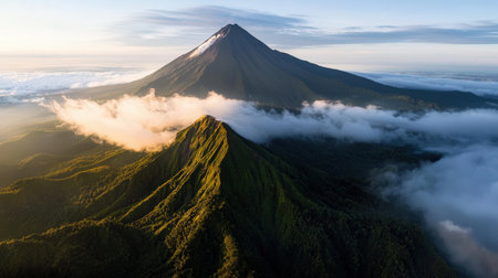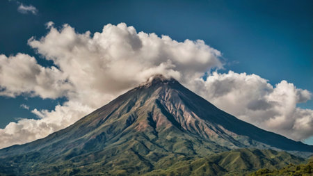 Majestic Southeast Asian volcano with a lush green base, towering over the landscape