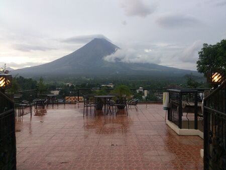 Legazpi City, Luzon, Philippines - Mount Mayon volcano looms over the city as daily life goes on