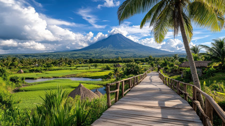 A Scenic view of Mayon Volcano with lush greenery and wooden pathway