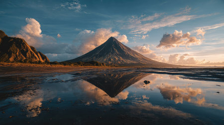 Calm volcano mirrored in shallow reflective water pool at golden hour