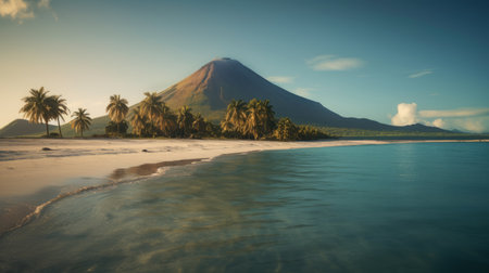a stunning tropical seascape at sunset, capturing the essence of a tropical island paradise. this photo, inspired by the style of sacha goldberger, showcases smooth curves and a mesmerizing blend of dark cyan and light brown hues. with a low depth of field and the use of vray, the image brings to life mystical creatures and landscapes, as if taken from a dream. ai generated