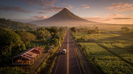 An open road stretches toward a large mountain under a colorful sunset. The scene captures the road's linear perspective, enhanced by the surrounding verdant fields. The image features a vehicle on the road and a quaint building in the foreground, ideal for commercial projects and visual storytelling.