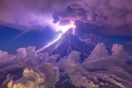 A majestic volcanic eruption lights up the night sky with flashes of lightning amidst swirling clouds.