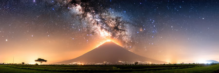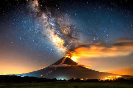 A spectacular volcanic eruption illuminates the night sky, blending natural forces with the breathtaking view of the Milky Way above the mountain.