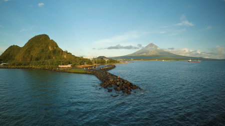 Harbor countryside town on river banks at volcano erupt aerial. Amazing cityscape at sea bay of Mayon Mount, Legazpi, Philippines, Asia. Buildings and cottages at green trees, plants, grass