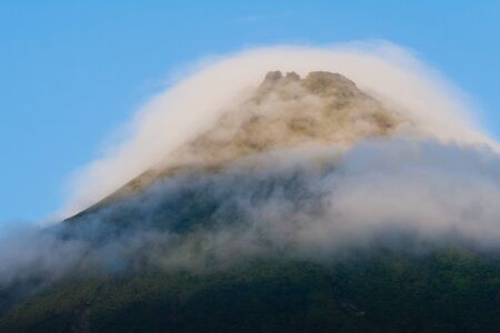 Tip of Arenal Volcano in morning light, surrounded by clouds