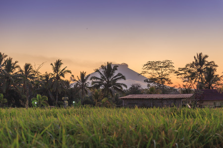 Fantastic sunrise with amazing view on volcano Agung and Jungles with Rice Terraces in Bali. series travels.