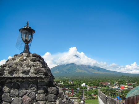 Legazpi City, Luzon, Philippines - Mount Mayon volcano looms over the city as daily life goes on