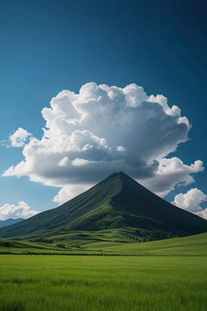 Beautiful landscape of green field and mountain under blue sky with clouds