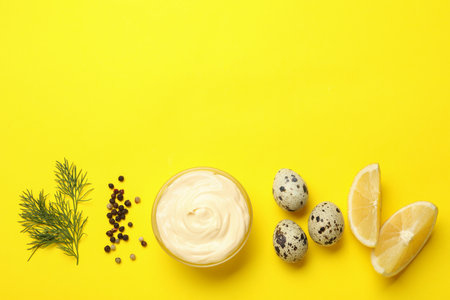 Bowl with mayonnaise and ingredients on yellow background, top view