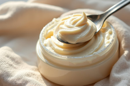 Richly textured vanilla cream in jar with spoon on soft fabric surface. That the image is generated using AI.