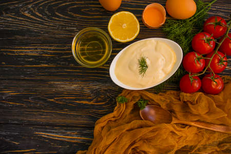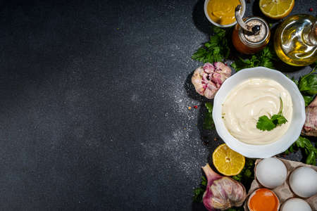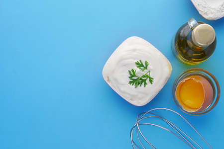 Homemade mayonnaise sauce. Bowl of mayonnaise with fresh ingredients top view copy space