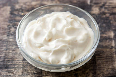 bowl of sour cream or greek yogurt on wooden kitchen table