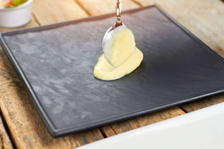 Homemade mayonnaise on a black background. Ingredients for making the sauce: egg, butter, mustard.