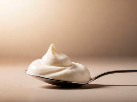 Sour cream in a spoon on a beige background close up