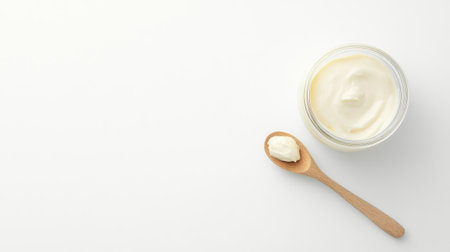 This image features a jar of fresh cream accompanied by a wooden spoon on a clean white background, perfect for food-related projects or culinary themes.