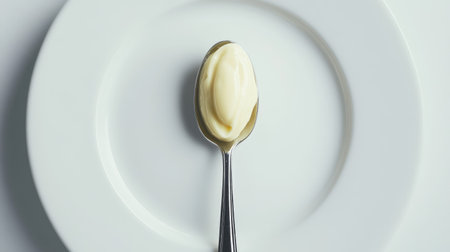 A close-up view of a spoon filled with smooth mayonnaise, resting on a pristine white plate. This image highlights the creamy texture and elegant presentation, perfect for culinary use.