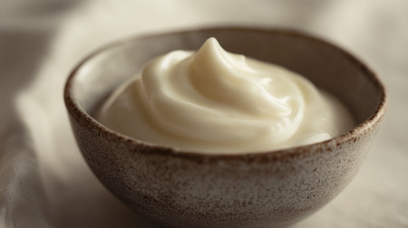 A close-up image of creamy mayonnaise elegantly swirled in a white bowl, showcasing its smooth texture, ideal for culinary inspiration and food styling. Perfect for recipes and presentations.