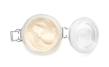 Mayonnaise in glass jar isolated on white, top view