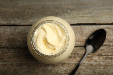 Jar of delicious mayonnaise and spoon on wooden table