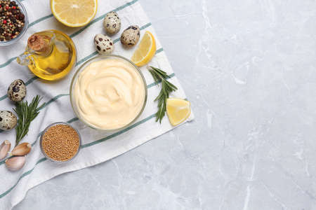 Delicious homemade mayonnaise, spices and ingredients on gray table, top view. Space for text