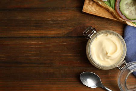 Jar of delicious mayonnaise near fresh sandwich on wooden table, flat lay. Space for text