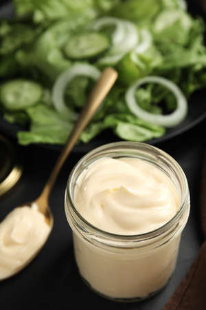 Jar and spoon with delicious mayonnaise near fresh salad on black table