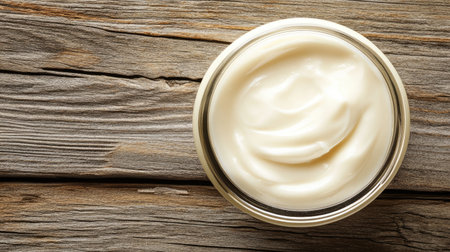 Smooth cream in a glass jar sits on a rustic wooden surface, offering a natural and fresh aesthetic ideal for skincare and beauty themes.