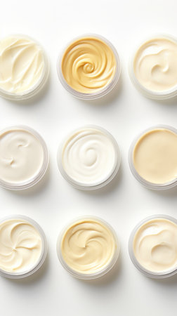 Variety of organic cosmetic creams for skin care in open jars on white background. Top view. Concept of skincare variety, cosmetics assortment, and beauty product display. Vertical format