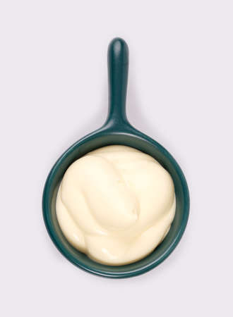 Mayonnaise in a bowl on a green background, top view