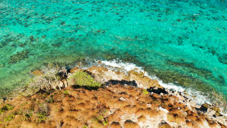 Coral reefs and atolls in the tropical sea, top view. Turquoise sea water and beautiful shallows. Philippine nature.