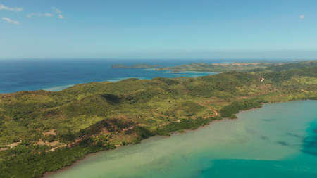 Tropical landscape, at sunrise time with mountains, tropical forest, bay, mangrove forest. Aerial view Seashore with jungle. Coron, Philippines,Palawan, Busuanga. Travel concept