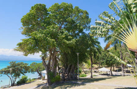 Beautiful seascape. Calm turquoise ocean, clear blue sky. In the foreground, the is red-soil hill, thickets of green trees. Madagascar. Nosy Iranja Copy space.