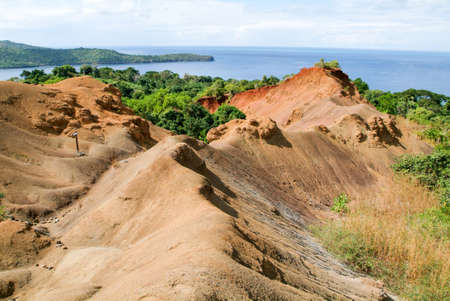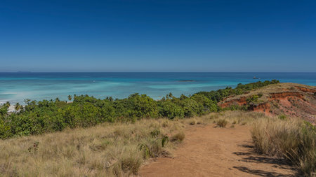 From the hill you can see the beautiful turquoise-aquamarine ocean and tiny islands. Yellowed grass and green trees grow on the red soil. Clear blue sky. Madagascar. Nosy Iranja.