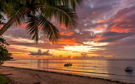 Beautiful sunrise tropical beach with palm tree and sky for travel and vacation in holiday