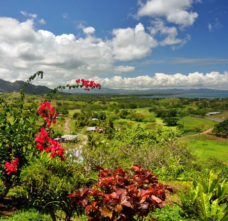 Vertical panorama of the Fijian west coast In the foreground Hibiscus - the Fijian national symbolic flower In the background Nadi and Denarau Island