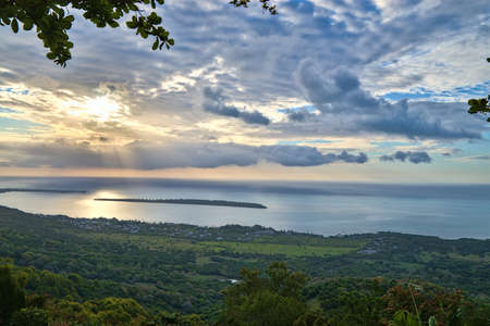 Epic aerial view of tropical island at sunset