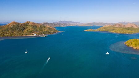 aerial view small island group in province of Palawan. Busuanga, Philippines. Seascape, islands covered with forest, sea with blue water. tropical landscape, travel concept