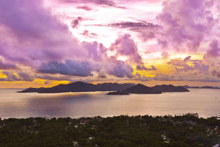 Seychelles, La Digue at sunset. Landscape with sky and colorful clouds. Sun at twilight on the calm sea on the horizon. View of Praslin island