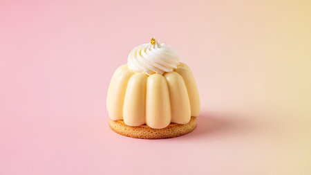 A single, elegantly presented yellow mousse cake topped with a swirl of white cream and a touch of gold leaf, set against a soft gradient background.