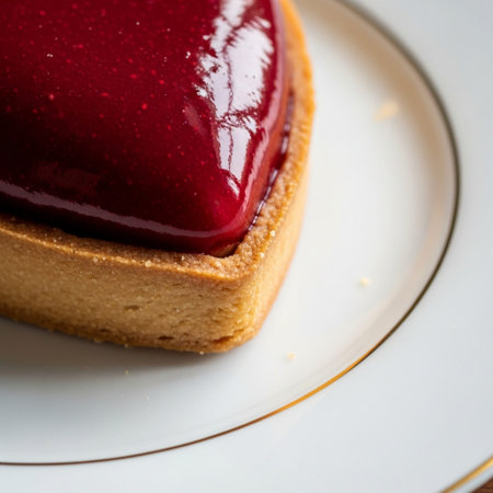 A hero detail shot featuring an intensely glossy, heart-shaped fruit tart centered within a perfect