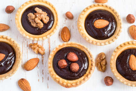 small Tarts with chocolate and different nuts on a white background, top view, closeup